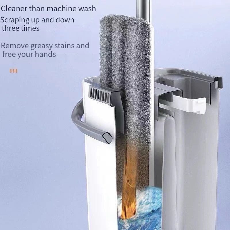 mopa que ahorra espacio con balde para facilitar su almacenamiento. Las almohadillas de mopa se fijan fácilmente al cabezal de la